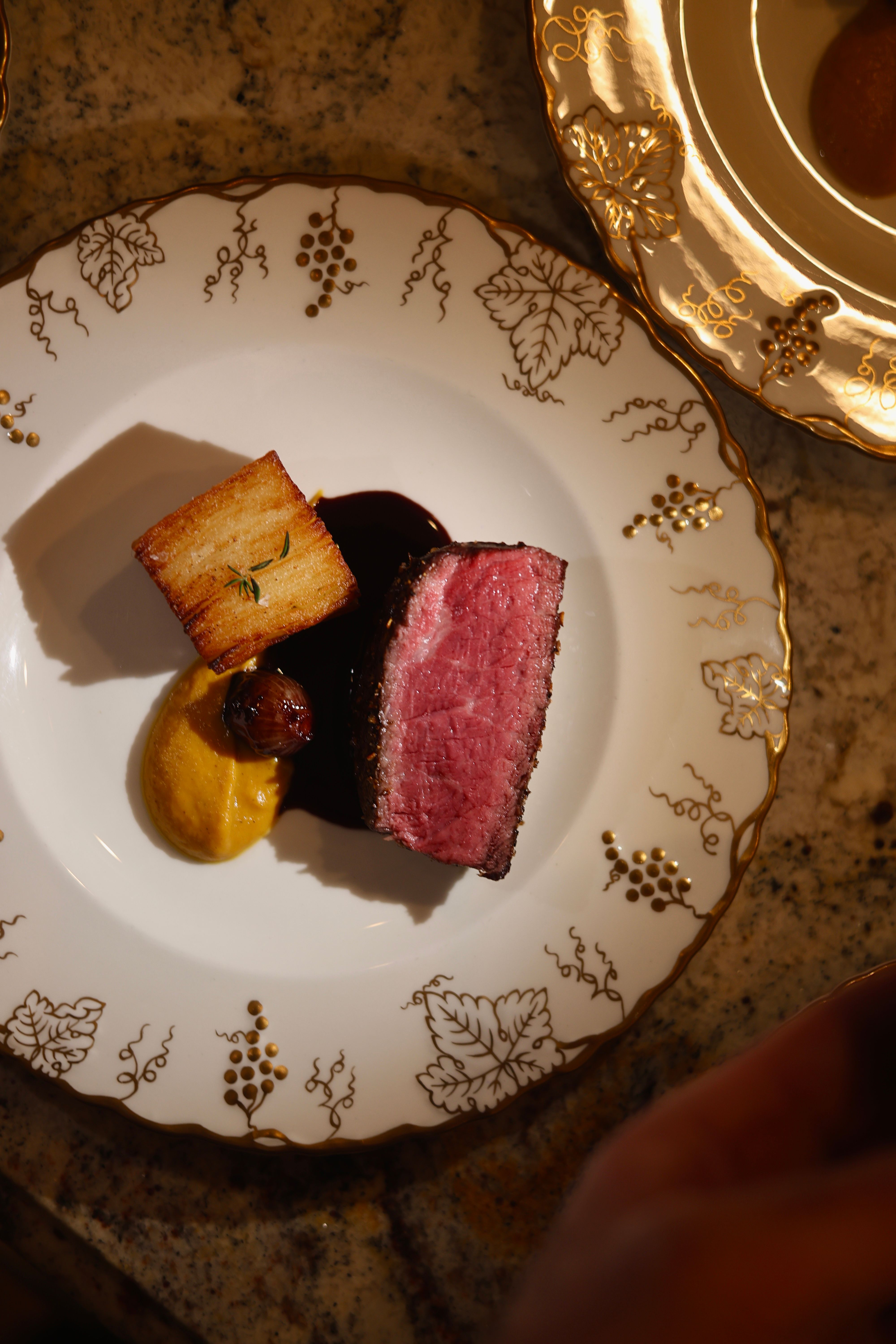 Sous Vide Dry-Aged Filet Mignon · Beurre Rouge · Thousand-Layer Potato · Butternut Squash · Braised Pearl Onion